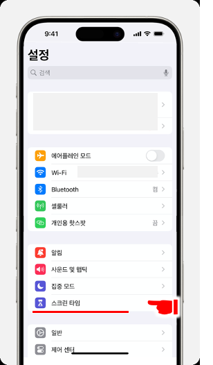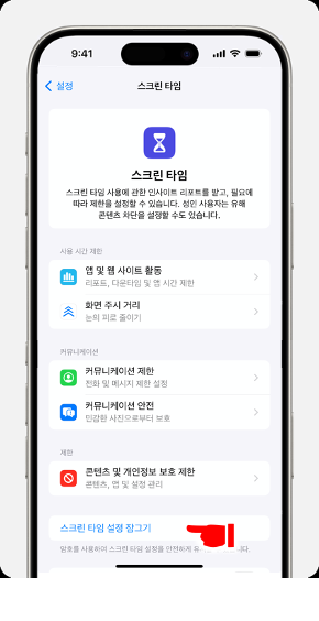- 기기의 암호 설정하기: 아래로 스크롤하여 '스크린 타임 설정 잠그기'를 탭합니다.