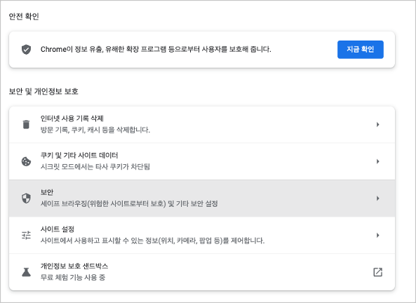3. 메뉴 "보안 및 개인정보 보호"를 클릭합니다.