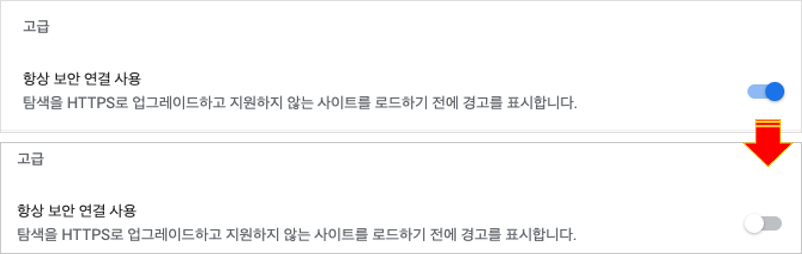 크롬 브라우저 사용할 때, '주의 요함'이 표시되는 http사이트에 접속하려고 하는 경우에 '보안 연결' 오류가 발생하는 문제가 있습니다.