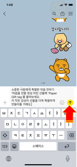 화살표 부분을 클릭하시면 문자 입력창의 내용이 채팅창으로 보내집니다.